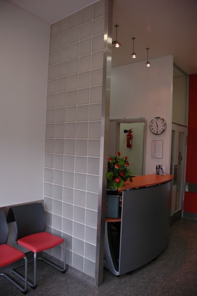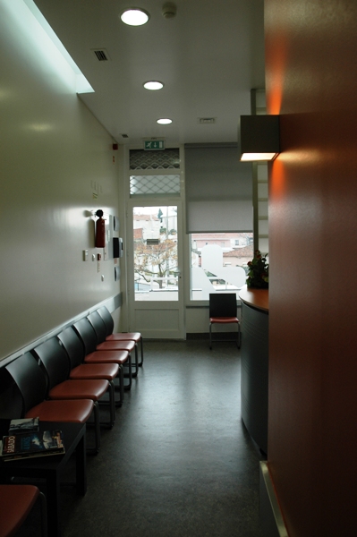 Nesta área foram criadas três zonas distintas: a zona de atendimento, a zona de espera e uma área para crianças. A zona de atendimento faz a ligação entre a zona pública de atendimento e o acessos aos gabinetes, controlando visualmente ambas as áreas.